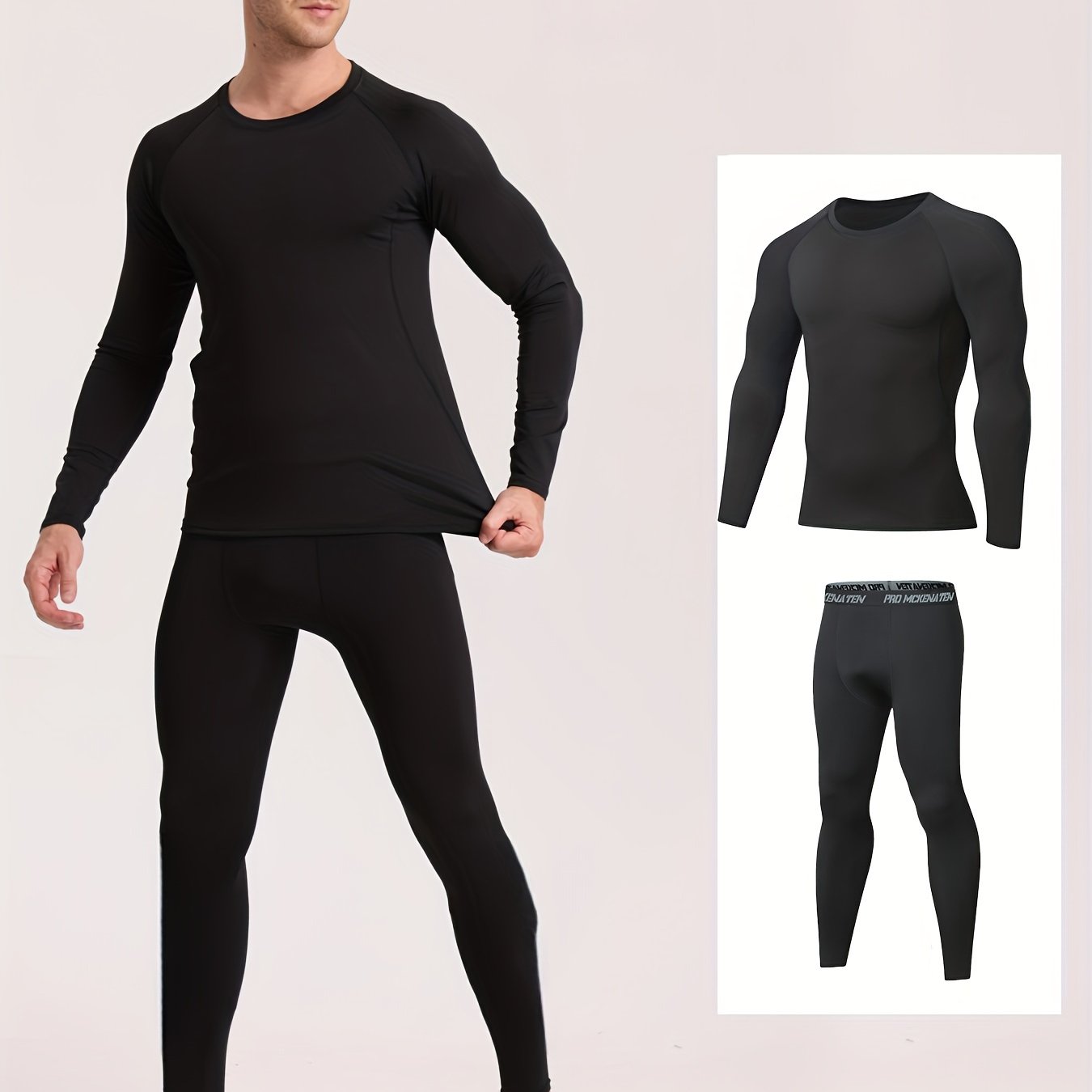 TEMU 남성용 엘리트 2pcs 열화상 속옷 세트 - 달리기 및 운동용 스포츠 베이스 레이어, 통기성 폴리에스테르, 땀 흡수, 습기 흡수, 타이트 핏, 롱 슬리브, 라운드 넥, 풀오버 스타일, 니트 직물, 95% 폴리에스테르 5% 스판덱스