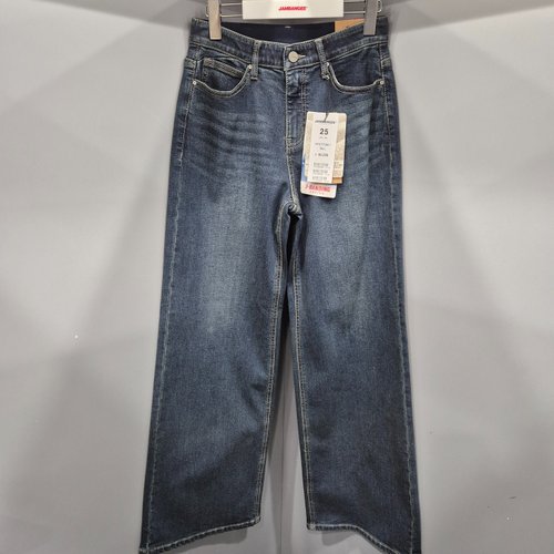 여성) 오비안밴드 시계포켓 틴 캣워싱 양모 스트레이트 데님 팬츠 다크블루