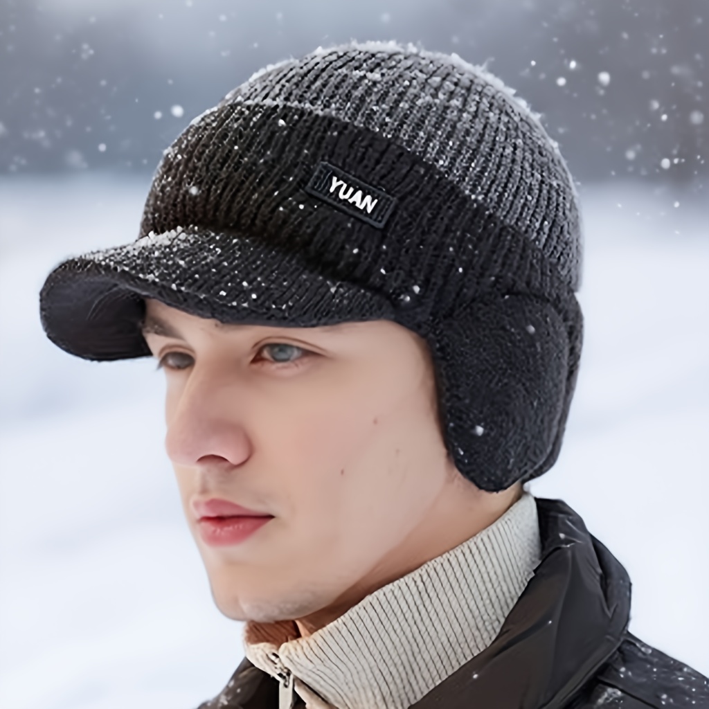 TEMU 남성용 귀 보호 모자 | 컬러 블록 디자인, 대비되는 색상, 귀 보호 기능 및 바이저 포함, 100% 아크릴 원단, 손세탁 가능, 야외 활동에 적합한 따뜻함