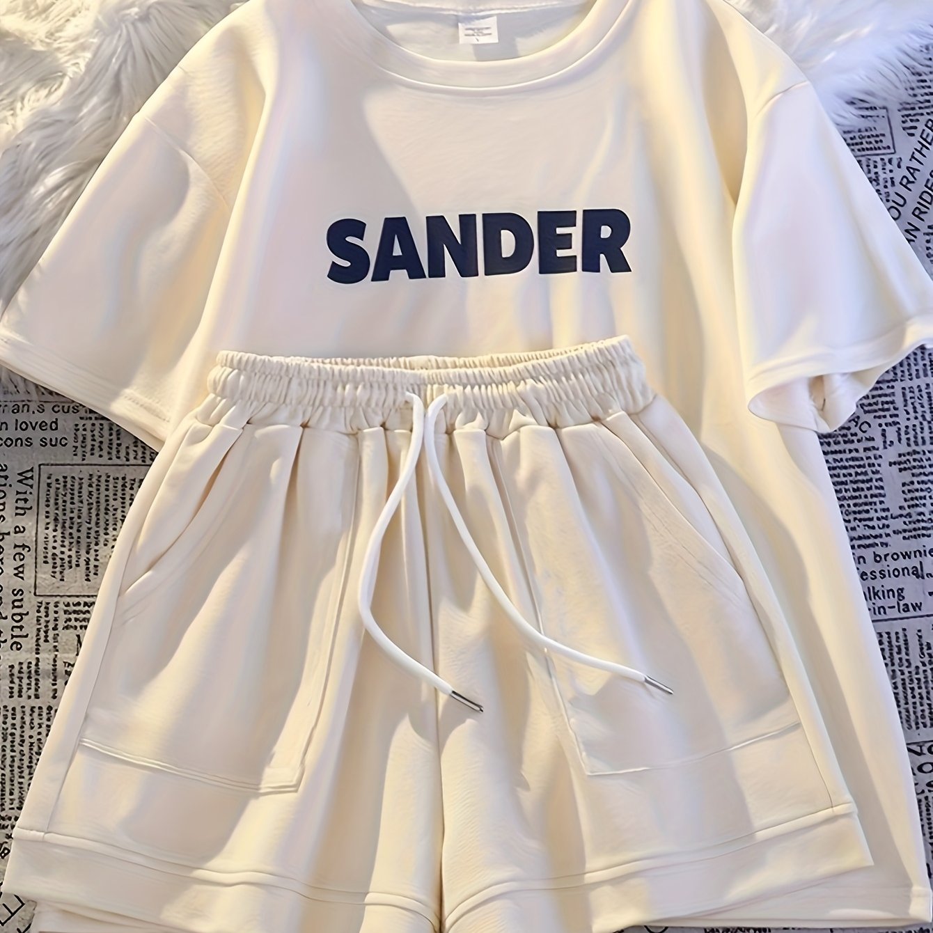 TEMU 여성용 캐주얼 '샌더' 프린트 반팔과 반바지 세트 - 베이지, 캐주얼 의상, 봄/여름, 캐주얼 의상|반바지|드로스트링 디테일