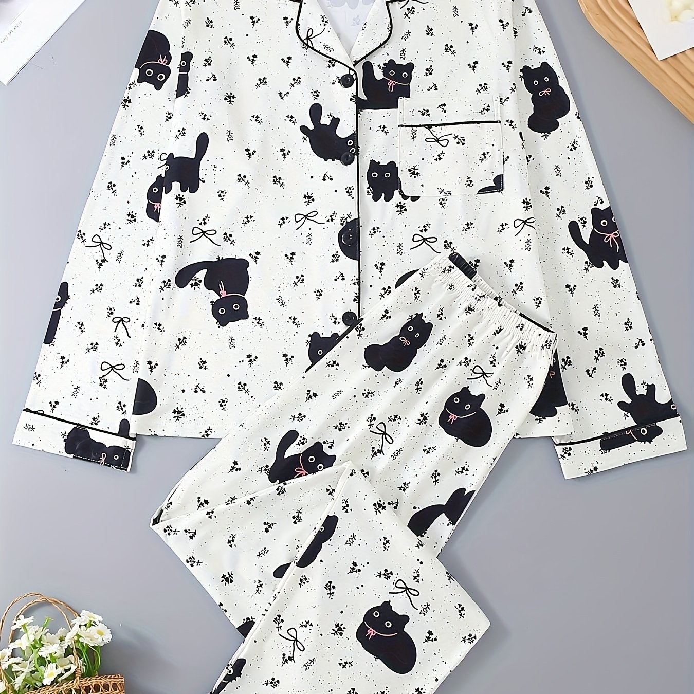 TEMU 검은 고양이 아기 패턴의 잠옷 세트. 상의와 바지로 구성되어 있어 편안하게 착용할 수 있습니다. 귀여운 만화 디자인, 버튼 칼라, 넉넉한 핏으로 집에서 편안하게 입을 수 있습니다.