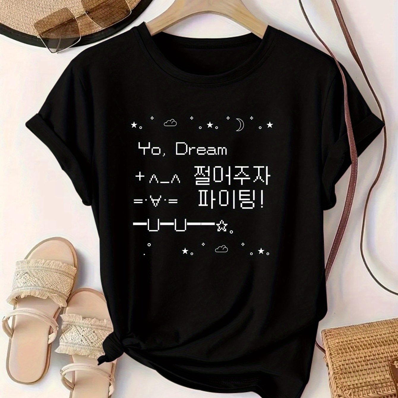 TEMU 여성용 캐주얼 크루넥 티셔츠, 한국어 문자 프린트, 부드럽고 통기성이 좋은 반팔 상의, 모든 계절을 위한 편안함, 캐주얼한 의상|한국 스타일 셔츠|적합한 핏
