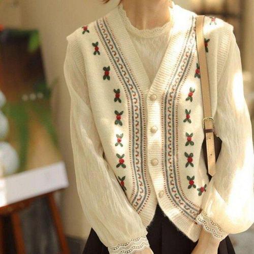 [모노무드]LMO 플로럴프린트 레트로 스타일 자수디테일니트조끼 시즌 슬리브리스탑 멀티컬러