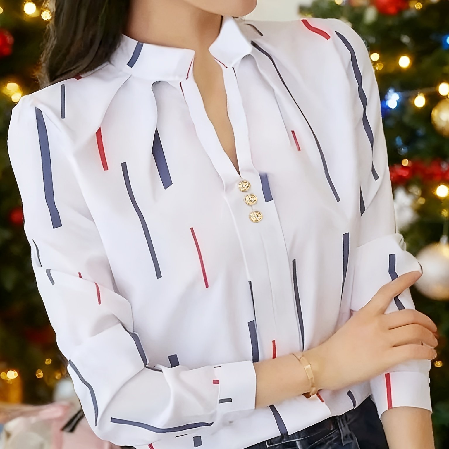 TEMU 여성용 프린트, 작은 스탠드 칼라, 정교한 버튼이 특징인 우아한 긴팔 셔츠. 봄, 여름 출퇴근 및 일상 외출에 적합한 아름다운 여성 셔츠, 여름 상의, 긴팔 V넥, 스타일리시한 블라우스