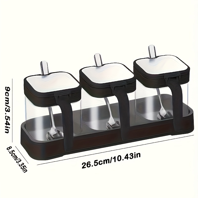TEMU 유리 재질의 덮개형 스파이스 용기 세트 (소금통, 설탕통, 검정색 트레이에 병 3개 및 스푼 3개 포함), 주방 및 식품 보관에 적합