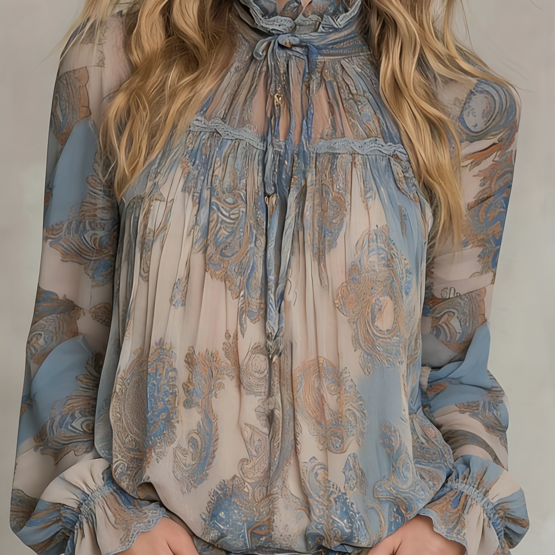 TEMU 봄/여름 신상 빈티지 반투명 스타일리시 프린트 스몰 스탠드 칼라 긴소매 셔츠 [ZLLZ]