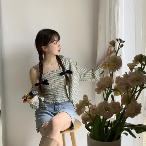 [린다샵]르피타 카라 긴팔 셔츠 체크 주름 나시 세트