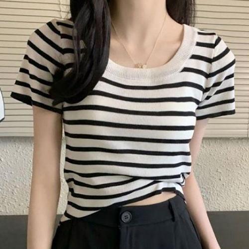 [엄지척]여성 여름 크롭 니트 블랙 화이트 줄무늬 모양 반팔티_19681889_667501