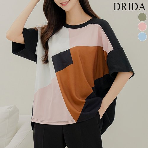 드리다 여성 여름 프린팅 배색 빅사이즈 반팔 티셔츠 40-50대 미시 중년여성 엄마옷 캐주얼 등원 모임 출근