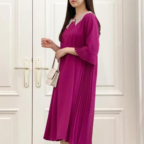 [옷자락]여성 주름옷 옆트임 칠부 라운드 중년 모임룩 롱원피스