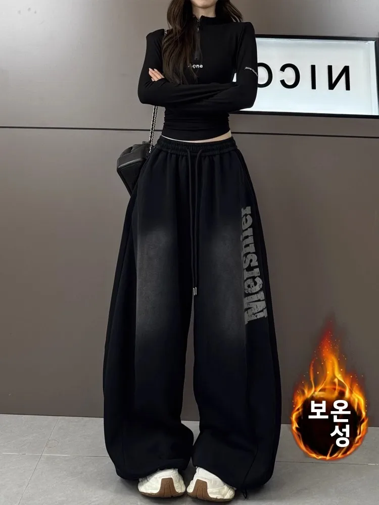 아메리칸 하이 스트리트 빈티지 워시드 그레이 블랙 와이드 레그 팬츠 여성용 가을 겨울 플리스 캐주얼 재즈 댄스 힙합 바지