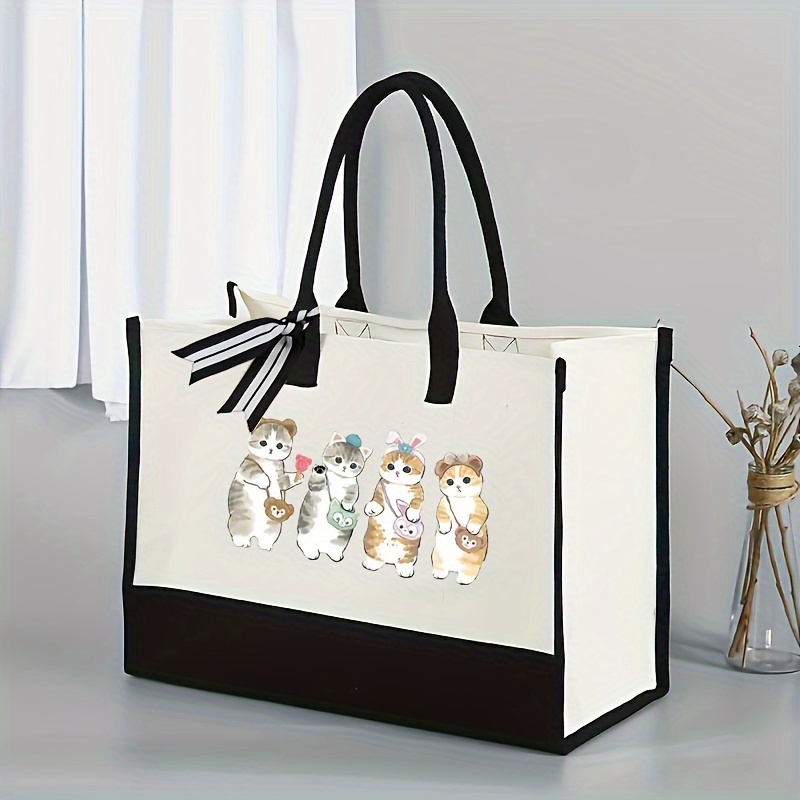 TEMU 스타일리시 고양이 프린트 토트백, 장난기 넘치는 고양이 일러스트레이션, 여행 및 쇼핑용 가벼운 나일론 캐리어, 오픈탑 디자인, 흰색과 검은 손잡이, 캐주얼 외출에 완벽한 백, 여행용 토트백 | 장식적인 리본 악센트 | 나일론 토트백