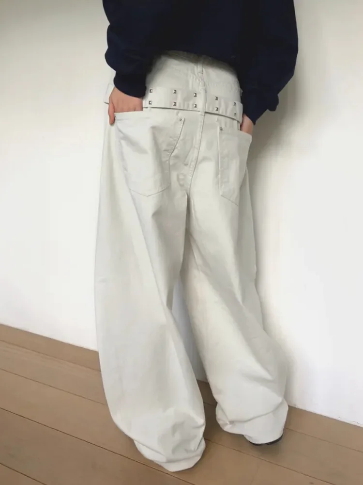 레트로 백 스터드 장식 루즈핏 와이드 레그 스트레이트 캐주얼 팬츠 여성용 벨트 디자인 데님 진 트렌디 코튼 캐주얼 트라우저