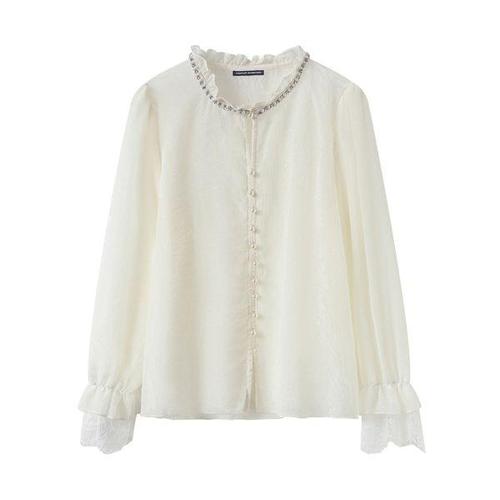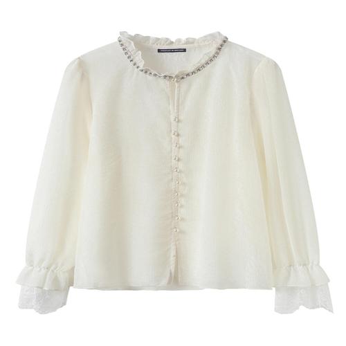 SAHINER 여성 레이스 블라우스 라운드넥 퍼프소매 진주단추 봄가을 ACS105