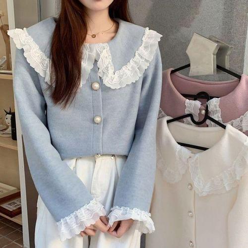 여자 페미닌 레이스 진주 프릴 블라우스