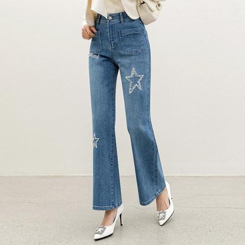 [스타일온미][스타일온미] 블루벨 진주 자수 별 레터링 화사한 무드 세미 와이드 데님 팬츠