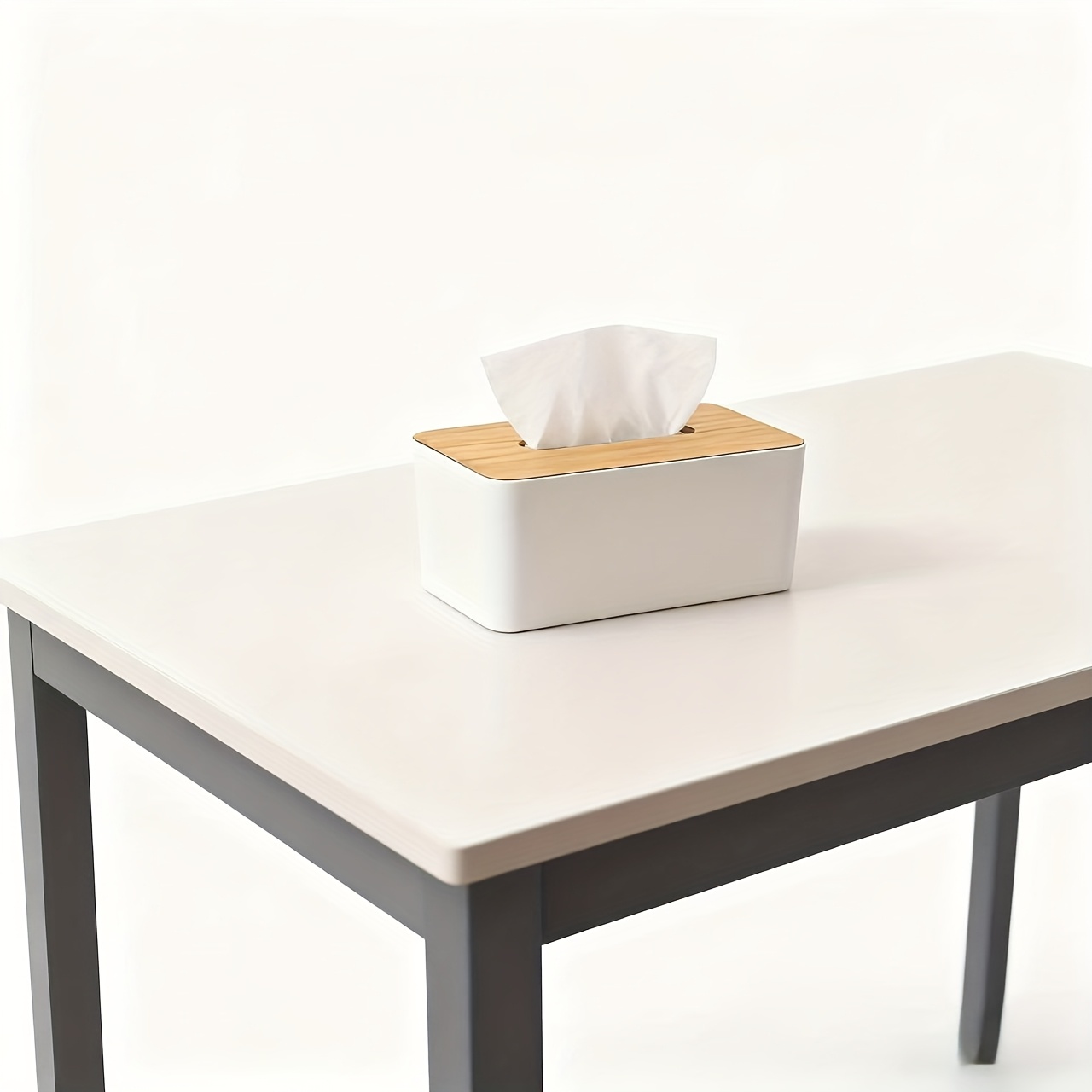 TEMU 모던 우드 티슈 박스 홀더 - 내구성 있는 플라스틱 사각 디자인과 나무 상단 커버, 욕실 및 드레싱 테이블용 스타일 오피스 데코 | 슬릭 화이트 마감, 공간 절약 디자인, 욕실 정리함, 장식용 티슈 박스, 천연 목재 마감, 티슈 보관함