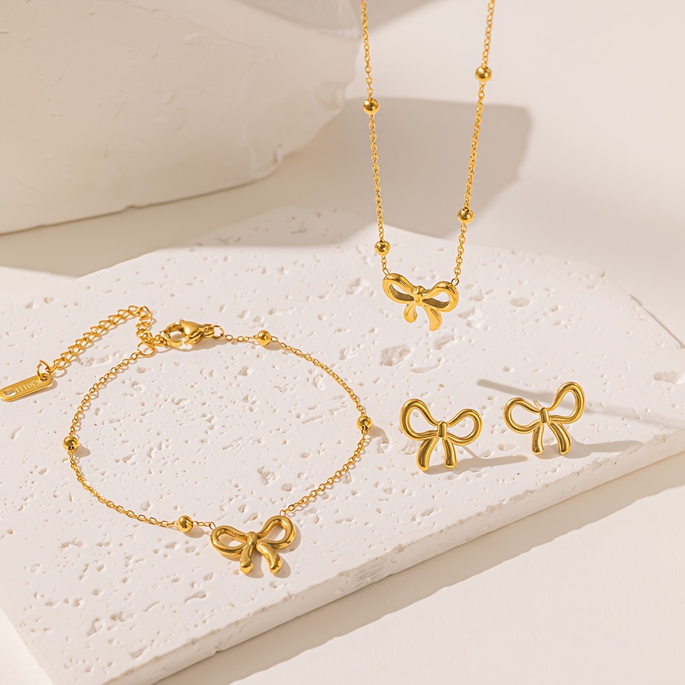 TEMU 4개 우아한 리본 펜던트 귀걸이, 팔찌, 목걸이 세트 | 18K 금도금, 304 스테인리스 스틸, 기하학적 평면 뱀 체인, 세련되고 고급스러운 분위기, 및 선물로 완벽