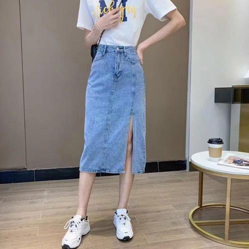 [옷자락]여성 중청 미디 데님 스커트 앞트임 키치무드