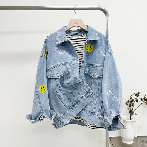 미즈큐즈 / 스마일 레터링 자수 오버핏 연청 데님 청재킷