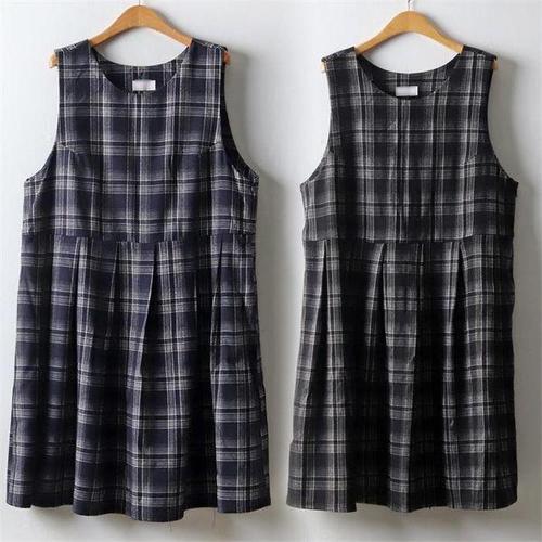 여자 빈티지 체크 더블 단추 민소매 롱 원피스