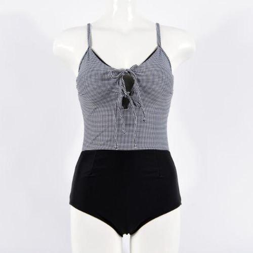 [옷자락]여자 더블 리본 포인트 블랙 체크 원피스 수영복