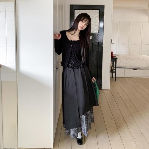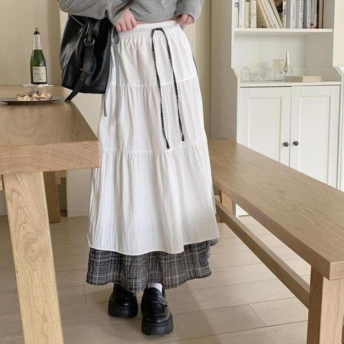 [옷자락]여자 데일리룩 편안한 레이어드 체크 롱스커트