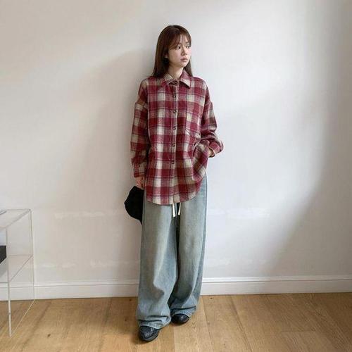 [옷자락] 여성 클래식 두꺼운 배색 체크 루즈핏 롱 셔츠