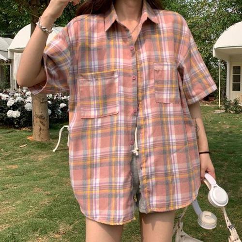 여성용 체크 무늬 셔츠 루즈핏 반팔 긴팔 가을 봄 패션 한국 스타일 학생 캐주얼 아우터 코트