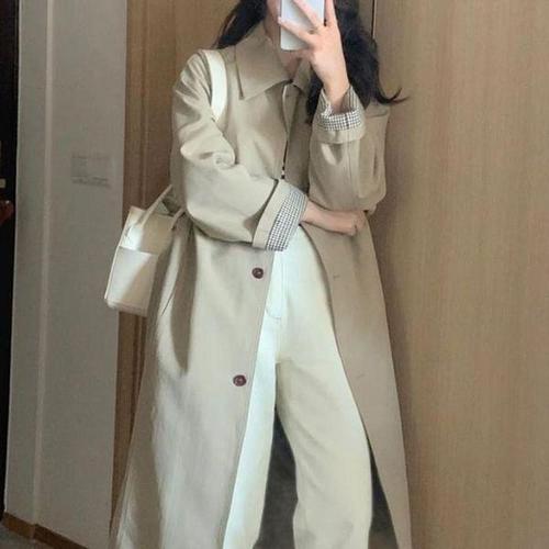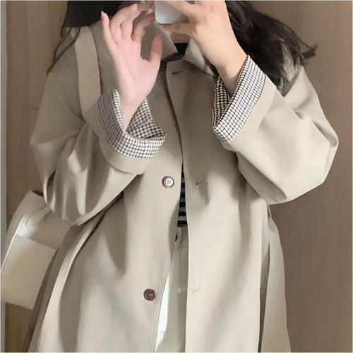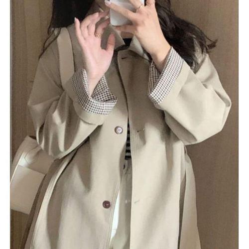 [옷자락]여성 체크 소매 안감 루즈핏 카라넥 트렌치코트 점퍼