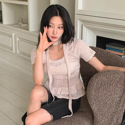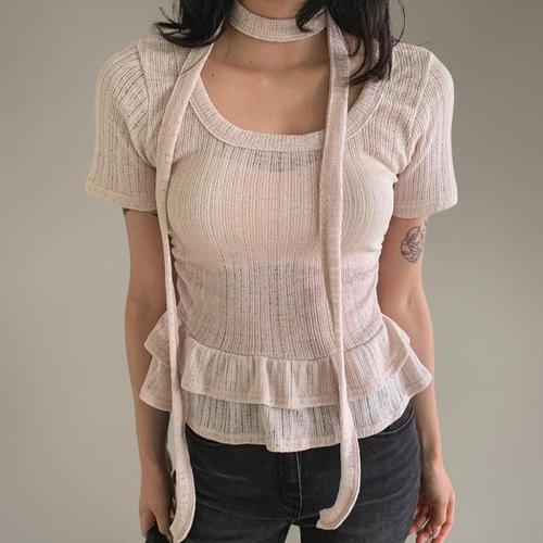 [다잇템]여자 초커 골지 프릴 반소매 비침 티셔츠