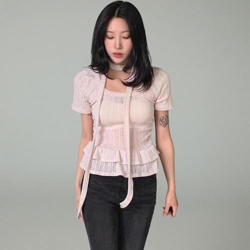[다잇템]여성 반소매 골지 초커 프릴 비침 티셔츠