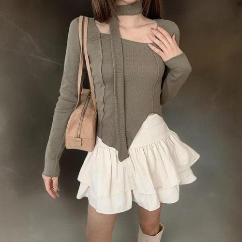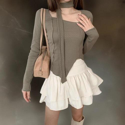 [다잇템]여성 초커 언발란스 키치 스트랩 긴팔티 니트