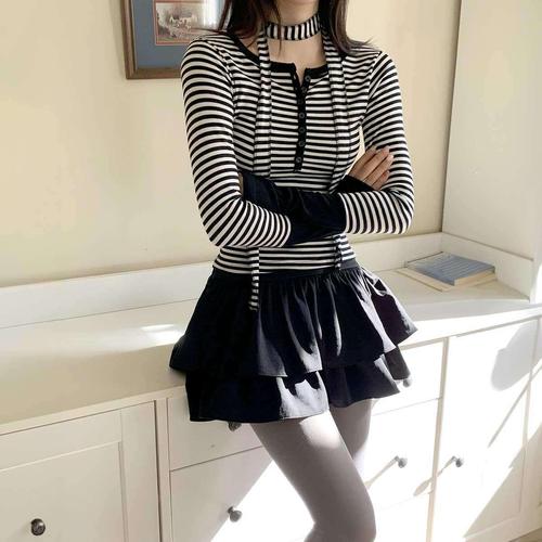 [시크블랙]루엔티 배색 스트라이프 버튼 헨리넥 티셔츠(초커set)