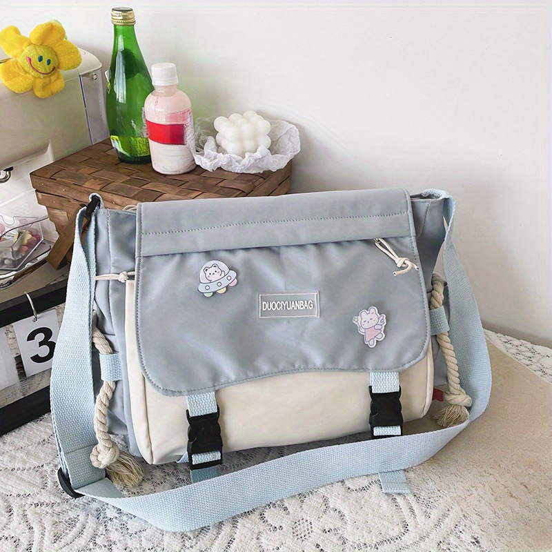 TEMU 빈티지 스타일 한국식 울장 나일론 크로스바디 백 - 대용량 투톤 파스텔 핑크 & 베이지 블랙 액센트, 귀여운 만화 패치, 조절 가능한 스트랩 & 태슬 디테일, 여성용 아카데믹 캐주얼 가방, 멀티펑셔널 퍼스, 재미있는 패치홀더 디자인
