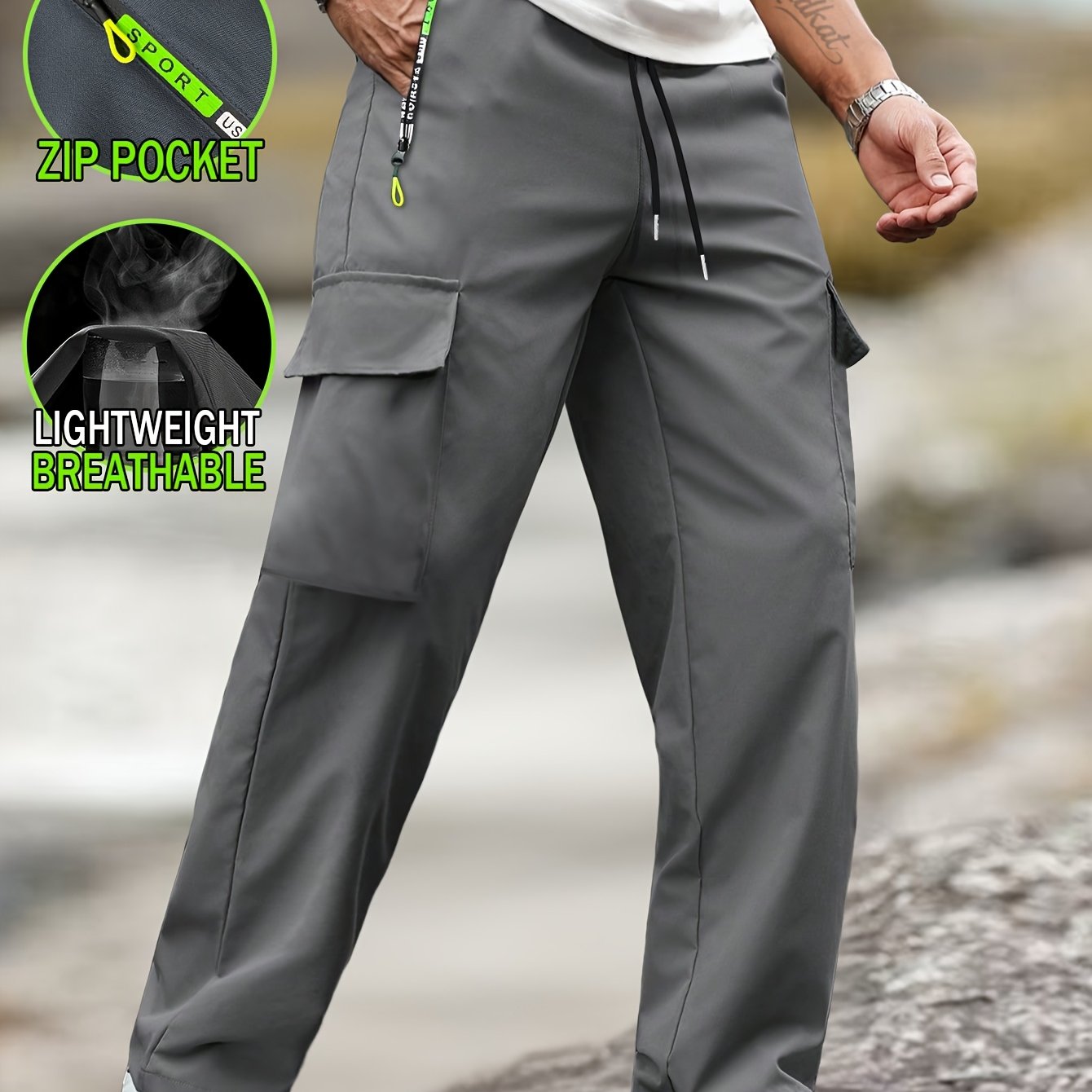 TEMU 남성용 캐주얼 테크웨어 카고 팬츠 - 가벼운 폴리에스테르, 다용도 포켓 디자인, 끈 조절 허리 & 소매, 사계절 야외 활동용 세탁기 사용 가능