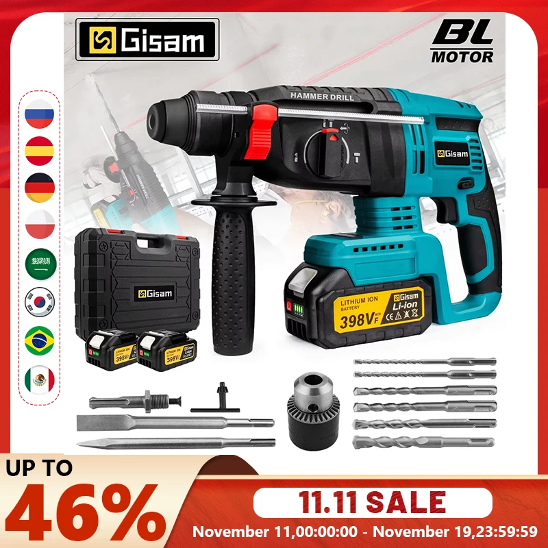 Gisam 26mm 브러시리스 전기 해머 다기능 로터리 드릴 해머 Makita 18V 배터리 용 무선 충전식 전동 공구