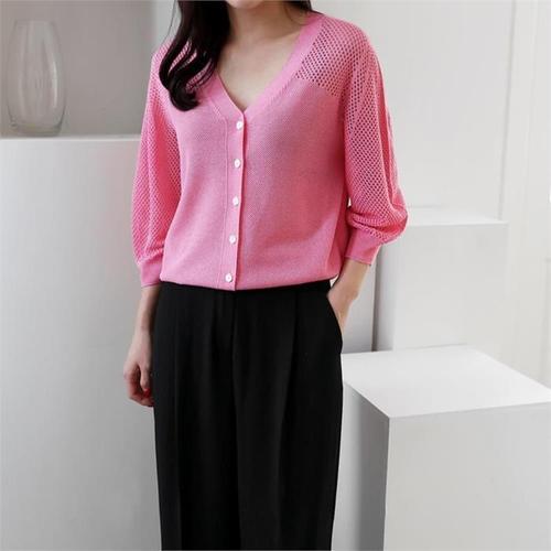 [다잇템]여자 비침 칠부반팔 민무늬 분홍색 Y넥 가디건 (9910950A)