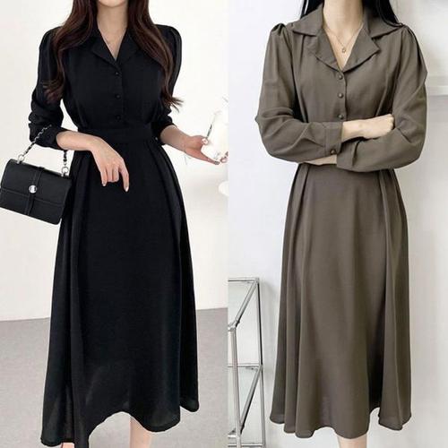 [오너클랜]인기상품 카라 브이넥 롱원피스 허리 뒷밴딩 앞허리 핀턱 주름 [WEAD992_250919]