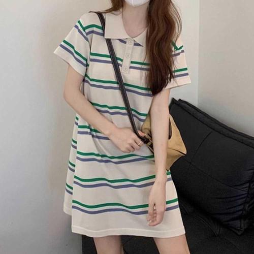 여성 여름 넉넉핏 스트라이프 카라 반팔 미디 원피스 WFJG30S