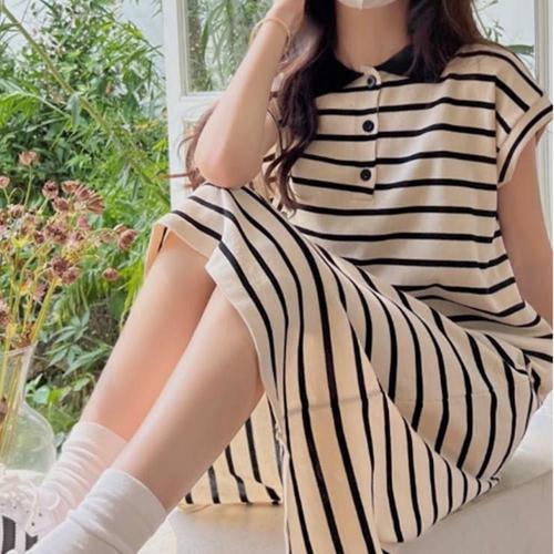 |CCO59EC|여성용 스트라이프 카라 반팔 미디 원피스 루즈핏