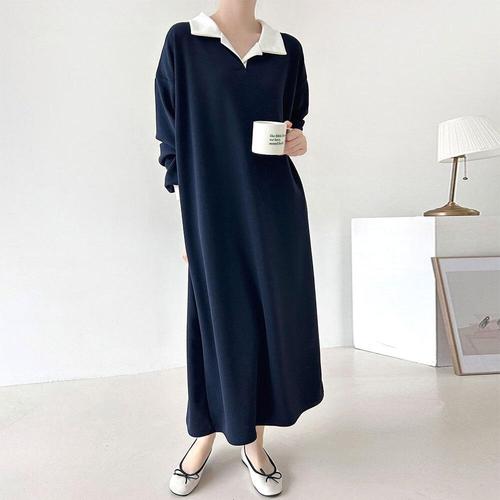 [문에이블]문에이블 여자 여성 봄 가을 간절기 데일리룩 편한 체형커버 루즈핏 배색 카라 롱 긴팔 원피스
