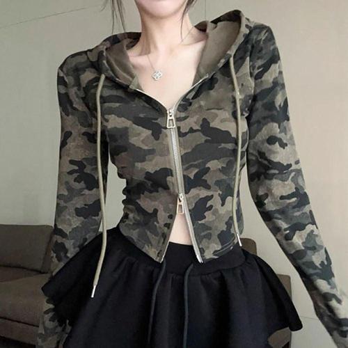 [센트럴몰]슬림핏 크롭 카모 후드 투웨이 지퍼 밀리터리 긴팔티