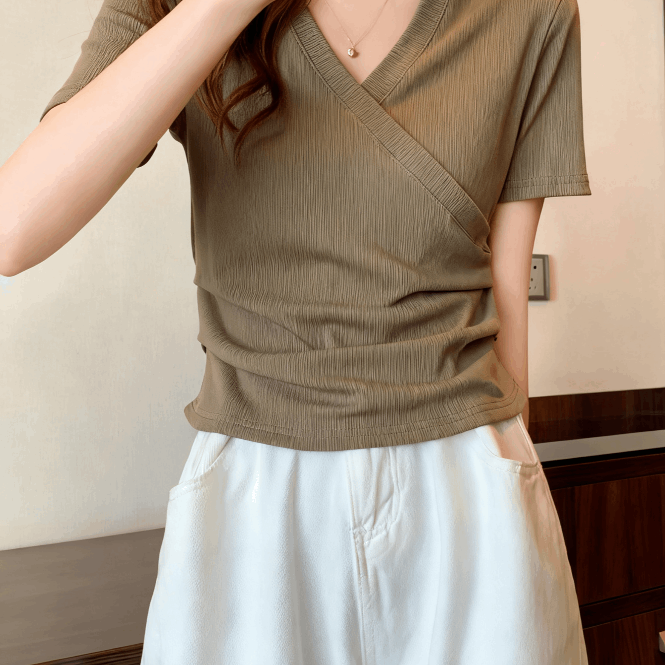 TEMU 여름 신상 크로스 V넥 반팔 티셔츠 여성용 슬림 핏 몸매보정 올인원 순색 숏 컷 상의