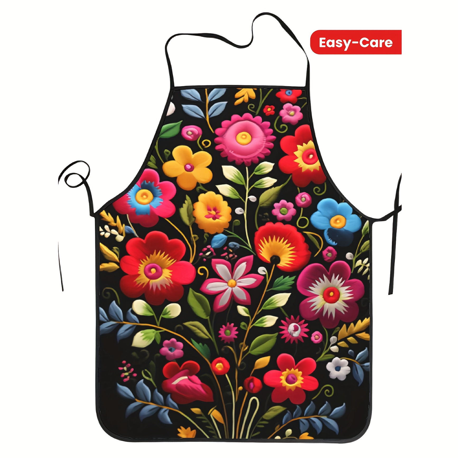 TEMU 화려한 멕시칸 플로럴 패턴 폴리에스터 앞치마 - 내구성 강한 민소매 주방 및 청소용 앞치마, 생동감 넘치는 꽃무늬 디자인