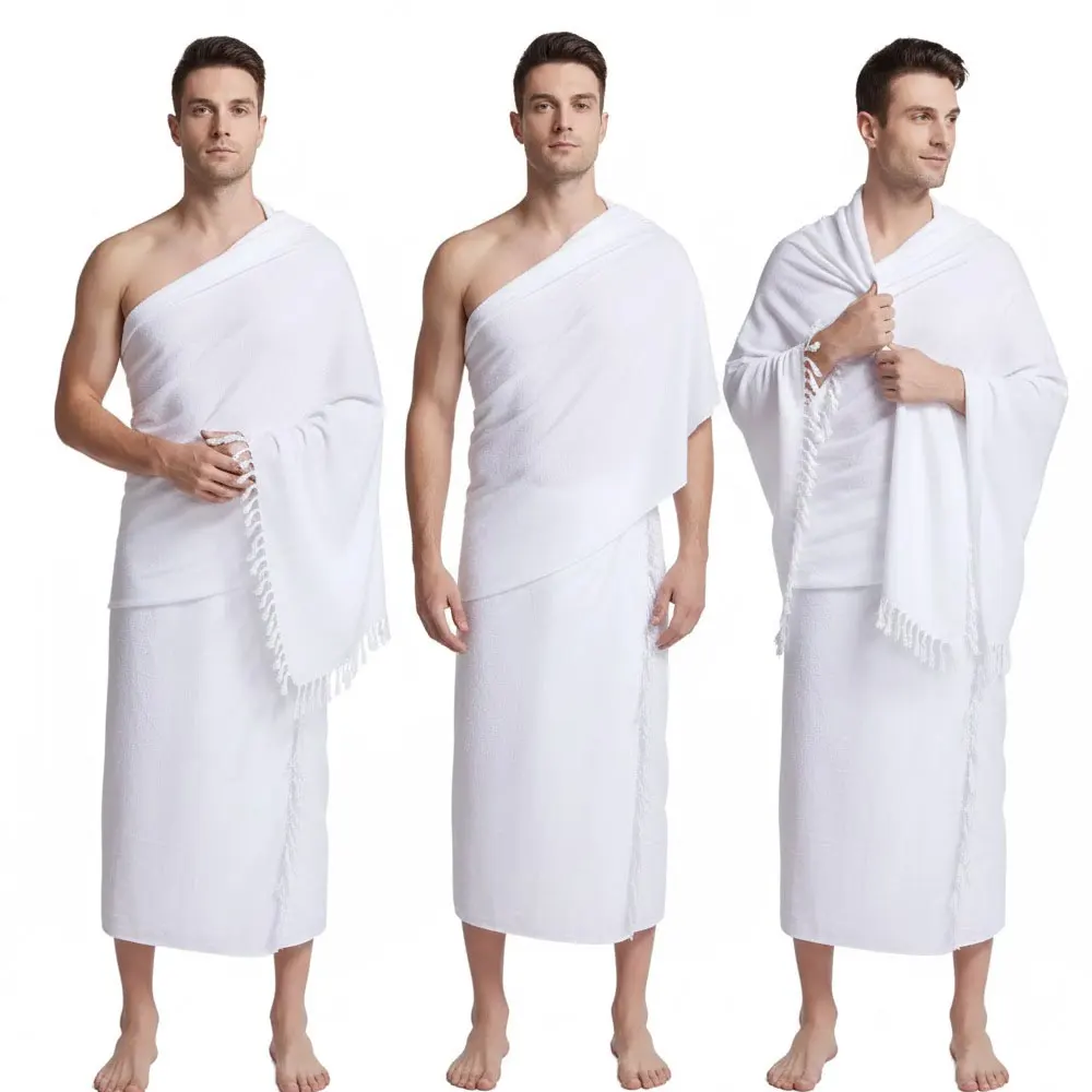 남성용 하지 및 움라흐 이흐람 2피스 세트 | 중동 솔리드 화이트 타월 슈트 | 정통 순례복으로 영적 여정을 시작하세요