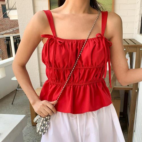 [신상오픈런]여성 리본 스트랩 캉캉 프릴 민소매 티셔츠