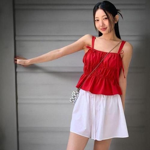 [신상오픈런]여성 면혼합 리본 스트랩 캉캉 프릴 민소매 티셔츠