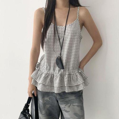 [옷자락]여성 체크 캉캉 프릴 어깨끈 나시티