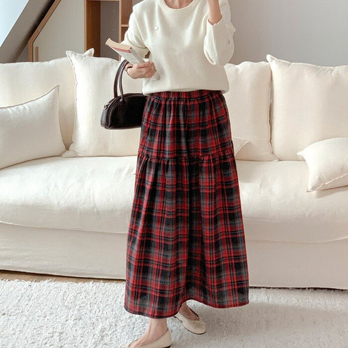 [신상오픈런]여자 가을 프릴 레이어드 캉캉 언발 체크 롱스커트